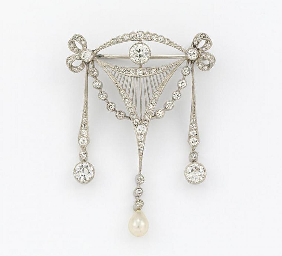 900/- Platin, Meistermarke und Punze verschlagen, Gewicht: 8,0g. H x B=ca. 4,3 x 3,1cm. Ca. 68 Diamanten im Alt- und Rosenschliff zus.ca. 1,102ct TCr-Cr(I-J) VS-SI2, 1 wohl Naturperl-Tropfen, weiß.