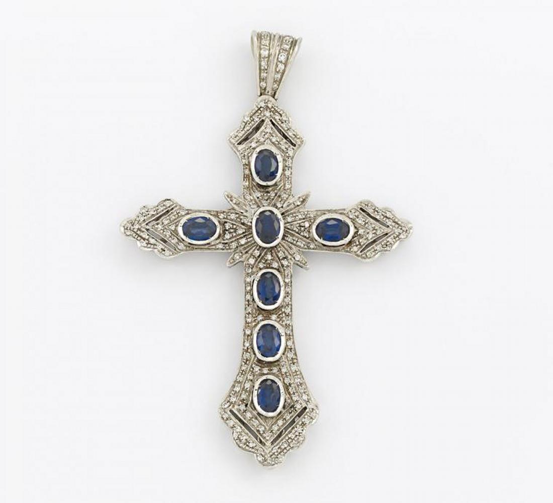 585/- Weißgold, Gewicht: 24,0g. H x B=ca. 8,3 x 5,4cm. Ca. 179 Brillanten zus.ca. 2,80ct W(H) SI1-P1, 7 oval facettierte Saphire zus. ca. 8,45ct.