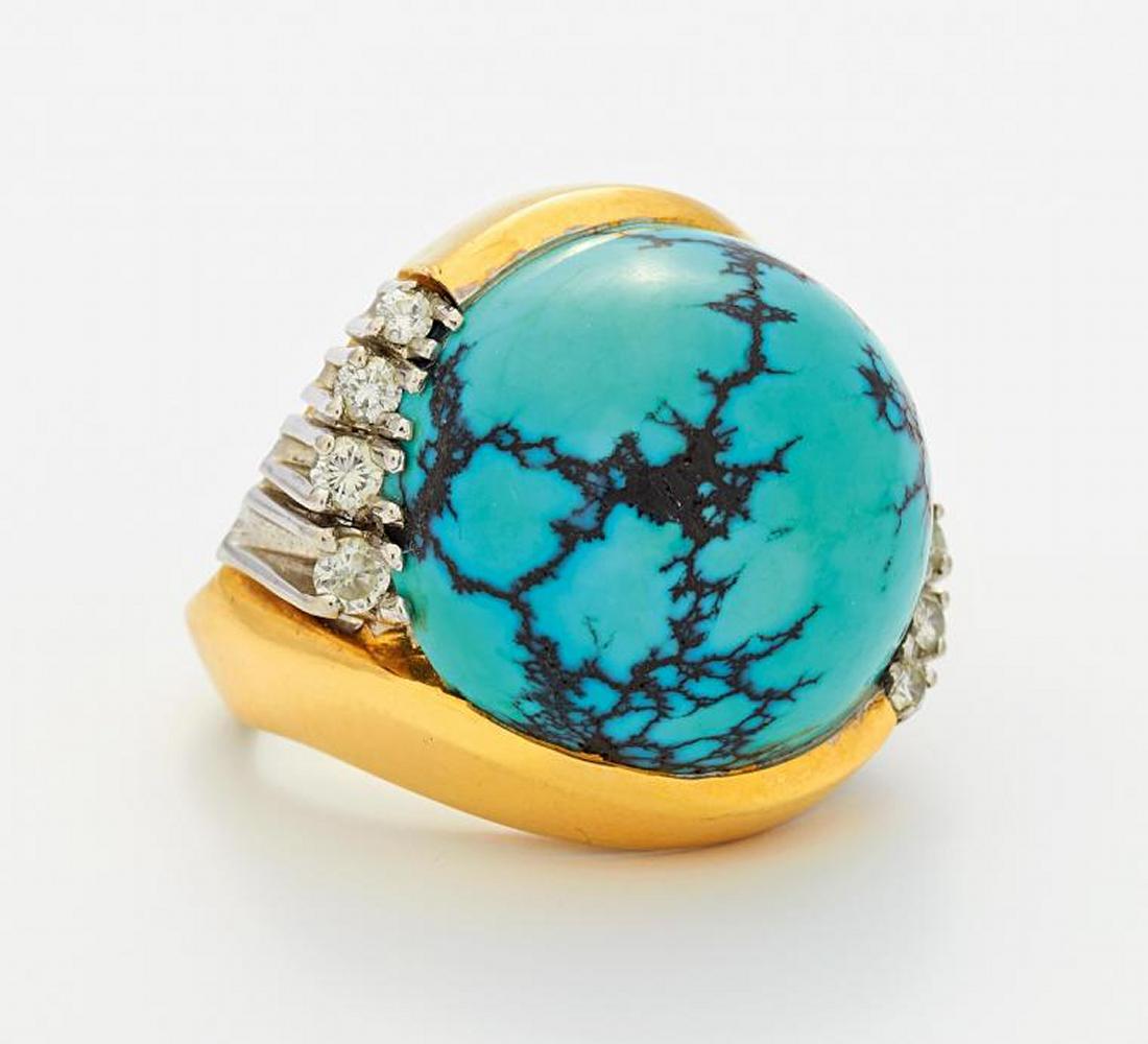 750/- Gelb-/Weißgold, gestempelt, Gewicht: 16,8g. EU-RM: 45. 8 Diamanten, 1 runder Türkis-Cabochon D.ca. 17,18mm.