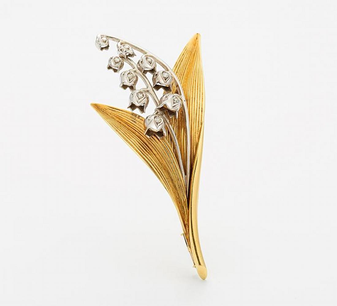 585/- Gelb-/Weißgold, gestempelt, Gewicht: 13,0g. H x B=ca. 7,1 x 3,5cm. 9 Diamanten im 8/8-Schliff.