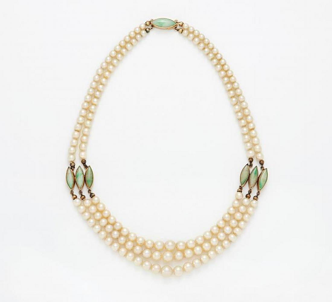 Zierschloss und Zwischenelemente: 585/- Gelbgold, Punze, Gewicht: 51,0g. L.ca. 42,0-45,7cm. 7 navette-förmige Jade-Cabochons, 156 Akoya-Zuchtperlen, 3-reihig, weiß-creme, D.ca. 4,50-7,50mm.