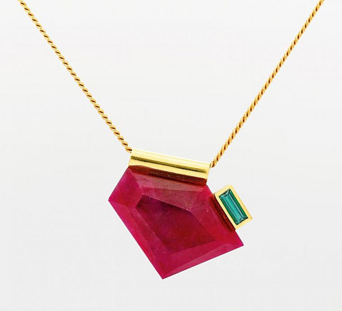 Anh.: 585/- Gelbgold, gest.; Kette: 333/- Gelbgold, gest., Gewicht: 19,2g. L.ca. 45,5cm. 1 facettierter, fancy cut Rubin, 1 facettetierter Turmalin im Baguetteschliff.