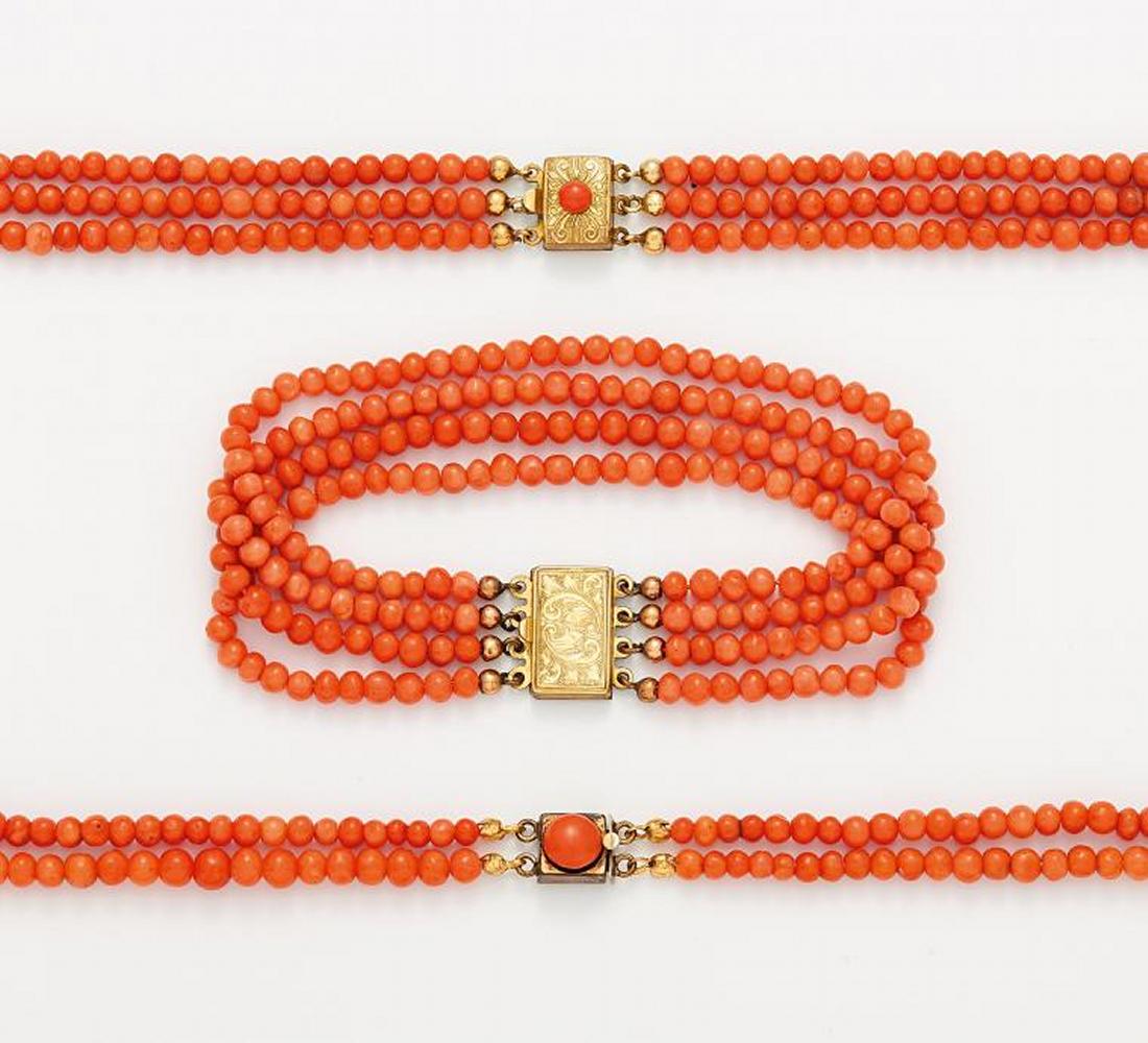 Zierverschlüsse: Messing, Doublé, Gewicht: 118,0g. Colliers L.ca. 58,0 und 71,0cm, A.band L.ca. 19,5cm. Vielzählige Korallperlen, D.ca. 7,93-3,49mm, Mittelmeer. 2 Korall-Buttons.