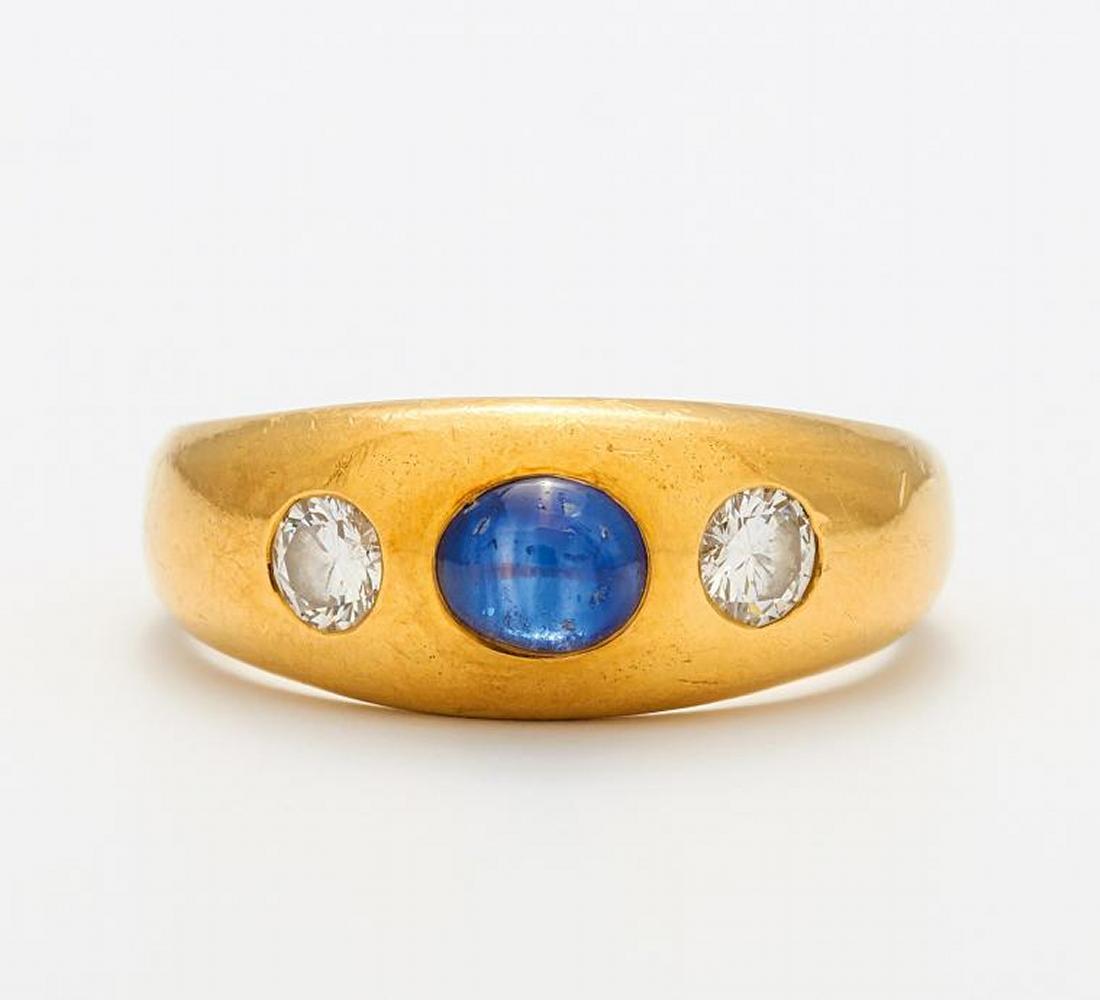 750/- Gelbgold, gestempelt, Gewicht: 6,3g. EU-RM: 54,5. 2 Diamanten, 1 ovaler Saphir-Cabochon.