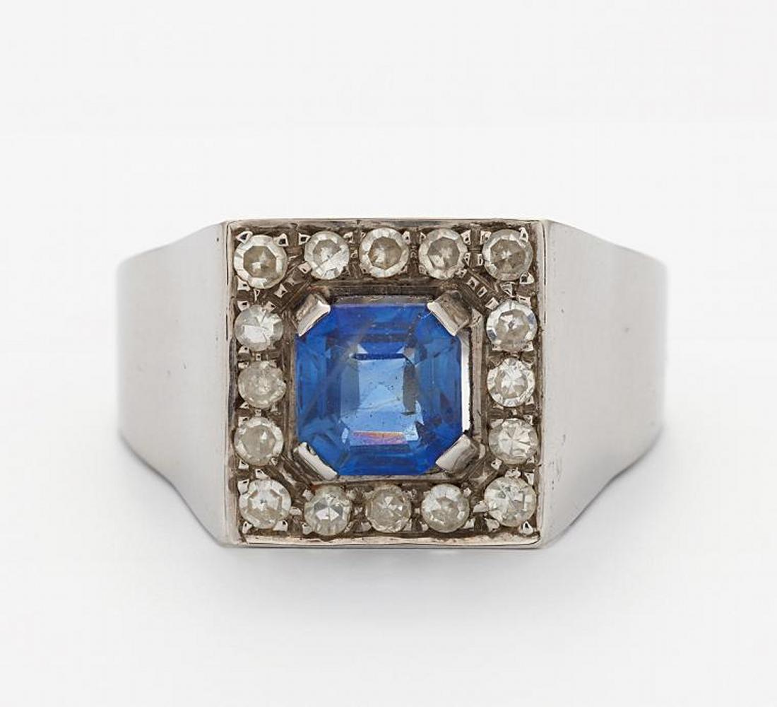 750/- Weißgold, gestempelt, Gewicht: 5,0g. EU-RM: 58,5. Ringtop: H x B=ca. 1,1 x 1,1cm. 16 Diamanten im 8/8- Schliff, 1 Saphir im Treppenschliff.