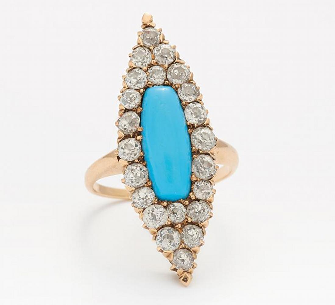 Roségold, Gewicht: 5,8g. EU-RM: 51,5. H.ca. 3,4cm. 23 Altschliff-Diamanten,1 fancy-cut Türkis-Cabochon.