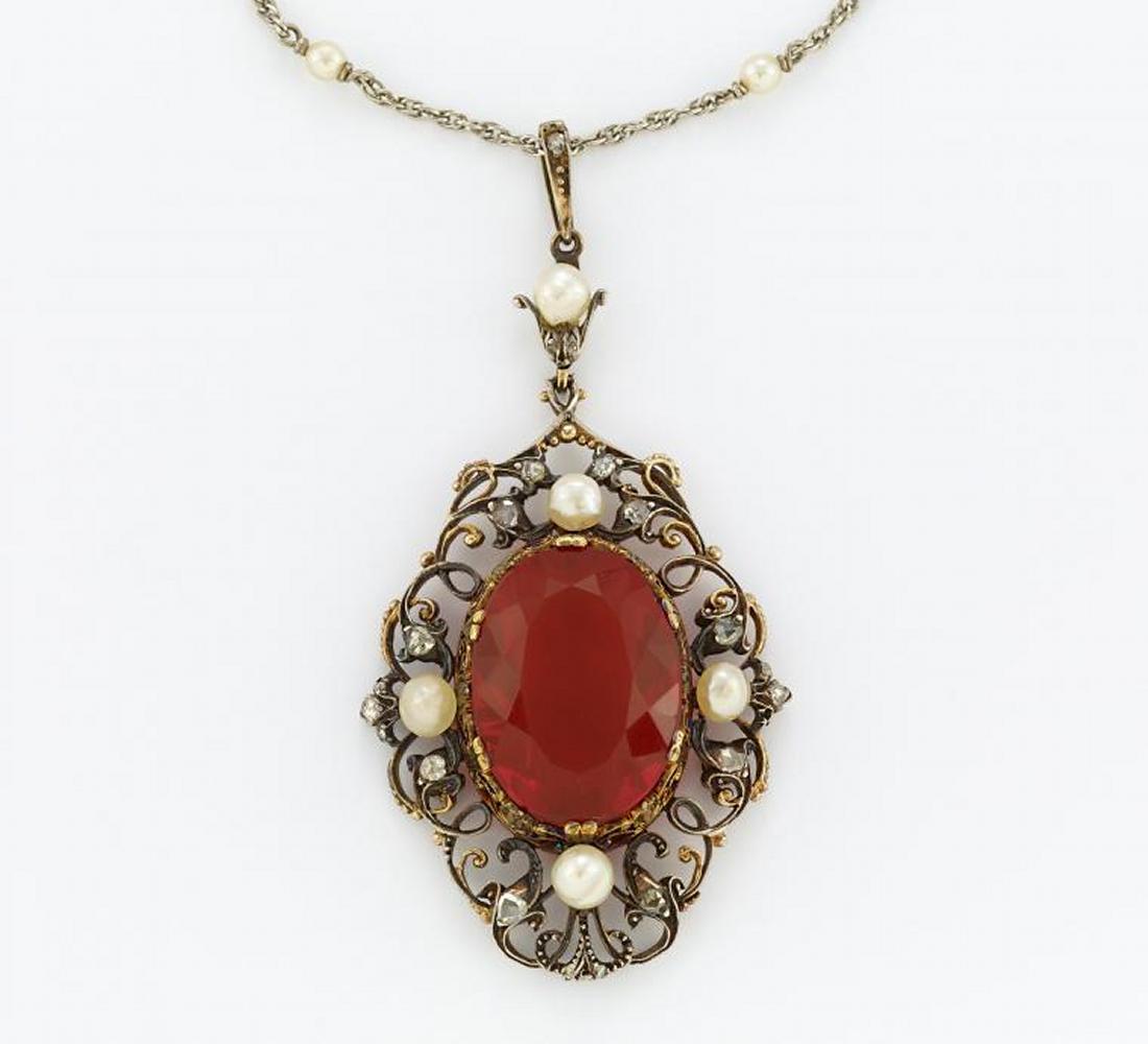 Silber/ vergoldet; Kette: 585/- Weißgold, gest. (verschlagen), Gewicht: 19,3g. L.ca. 61,2cm. Ca. 20 winzige Diamantrosen (eine fehlend), 1 oval facettierter Feueropal D.ca. 22,53 x 16,42mm, 5 barocke Naturperlen, 16 runde Süßwasser-Zuchtperlen.