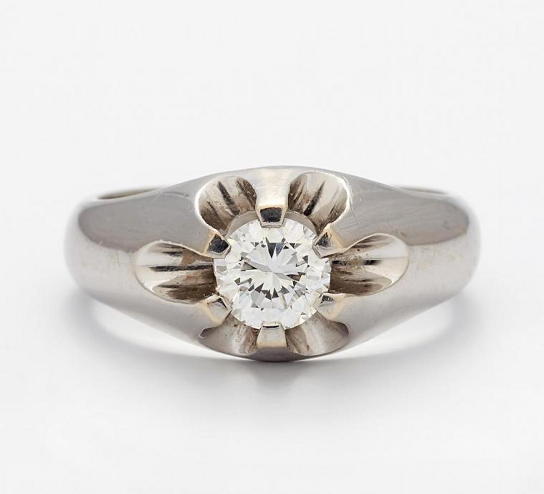 585/- Weißgold, gestempelt, Gewicht: 7,5g. EU-RM: 56,5. 1 Brillant, D.ca. 5,75-5,69mm.