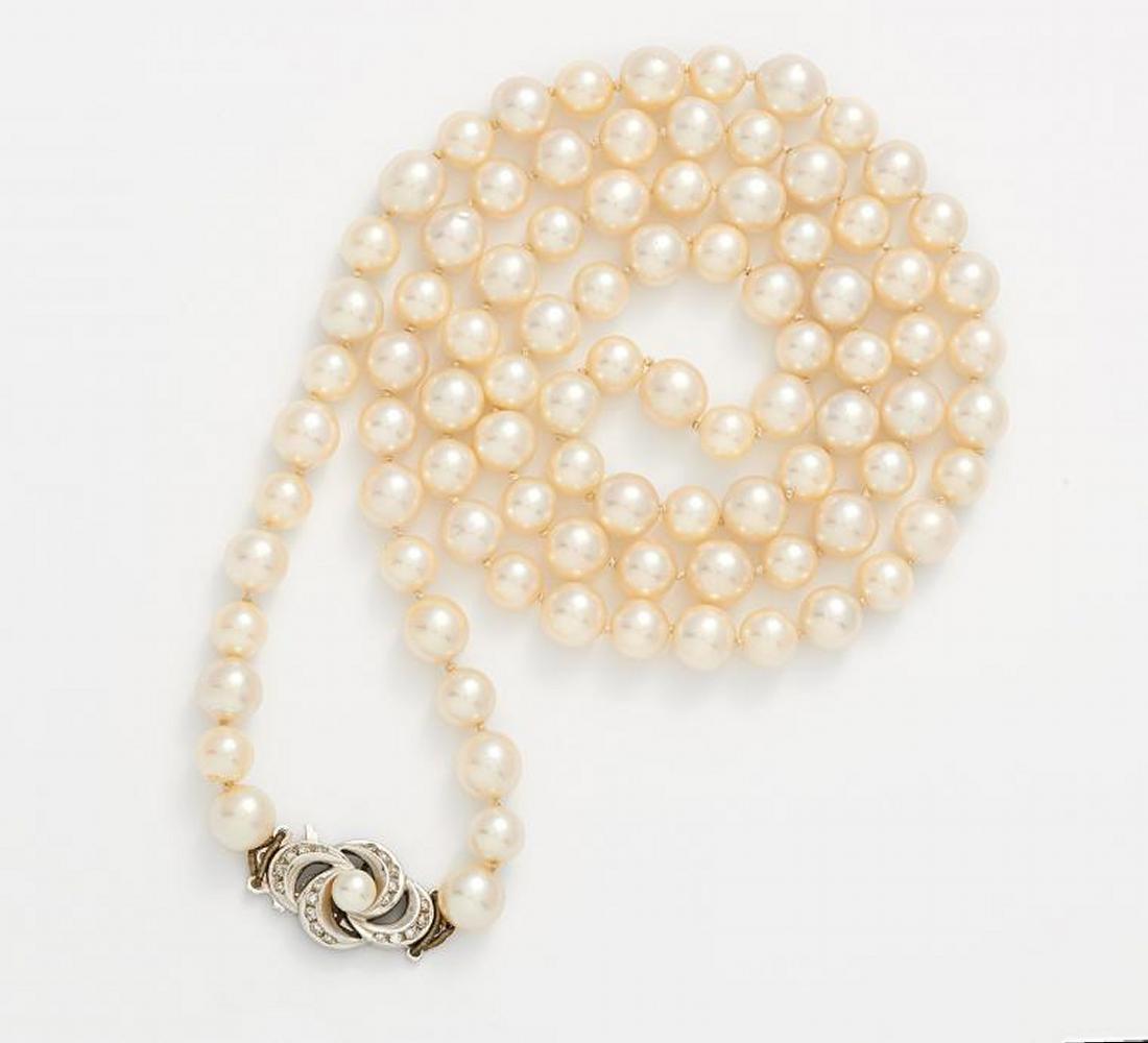 Zierverschluß: 585/- Weißgold, gestempelt, Gewicht: 72,4g. L.ca. 85,5cm. 20 8/8-Diamanten, 91 Akoya-Zuchtperlen, D.ca. 8,71-7,68mm, creme-anthrazit-rosé.
