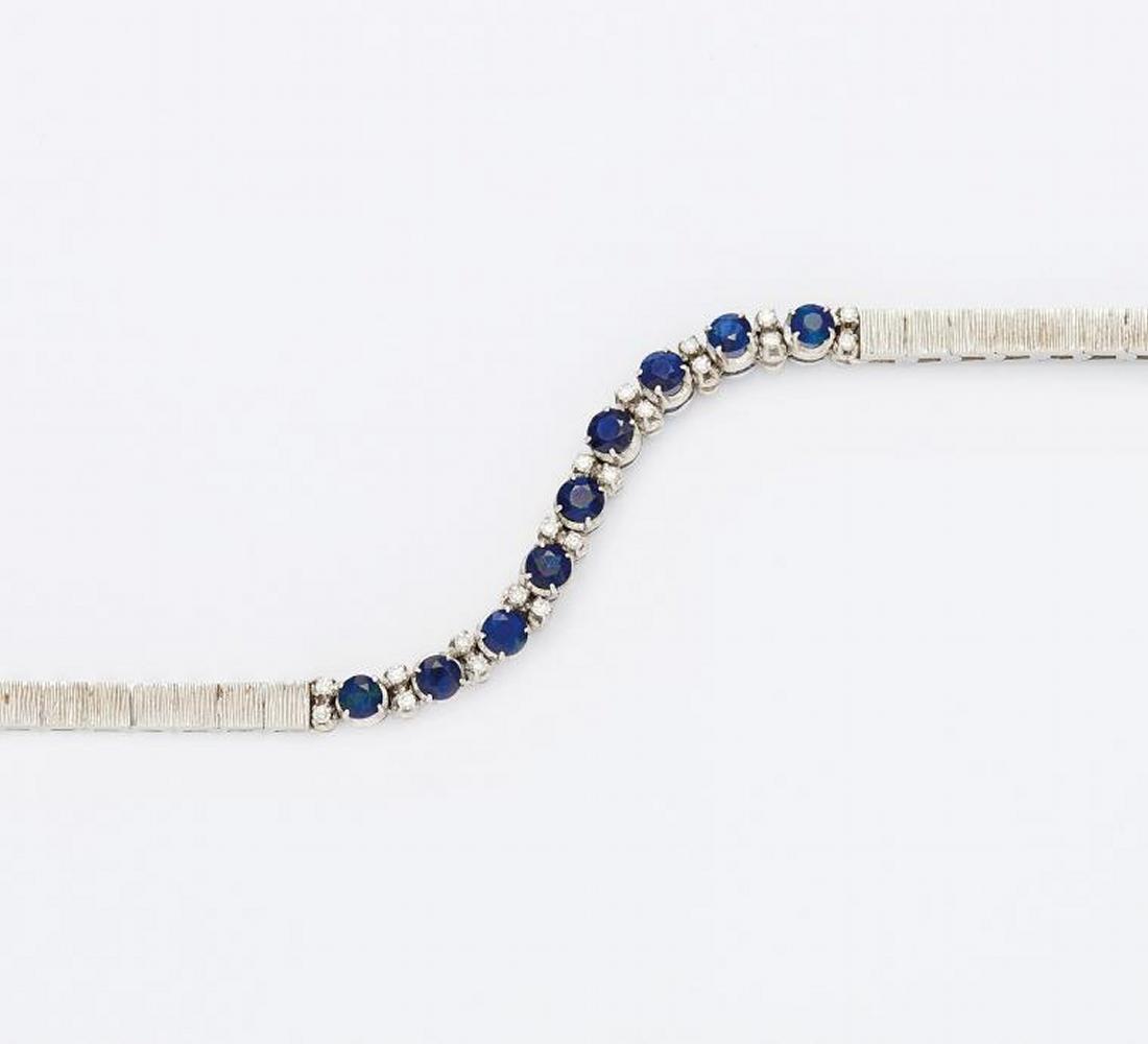 750/- Weißgold, gestempelt, Gewicht: 15,5cm. L.ca. 18,3cm. 20 Diamanten im 8/8-Schliff, 9 rund facettierte Saphire.