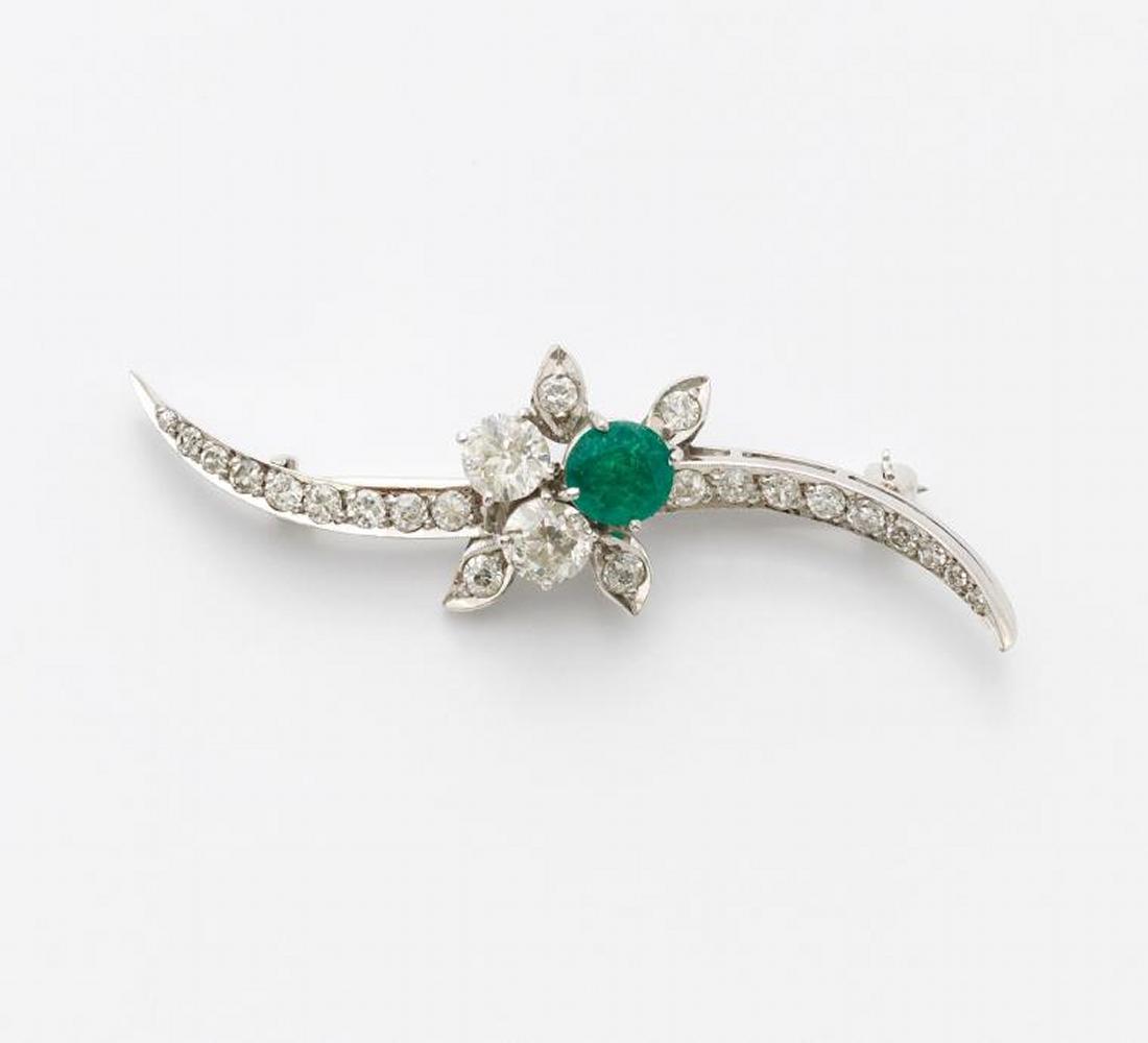 Weißgold, Gewicht: 5,0g. L.ca. 5,2cm. 24 Diamanten im 8/8- und Altschliff, 1 rund facettierter Smaragd.