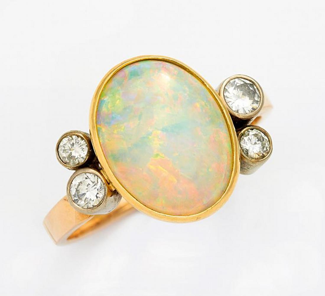 Gelb-/Weißgold, Gewicht: 5,6g. EU-RM: 63. 4 Diamanten, 1 ovaler Milchopal-Cabochon.