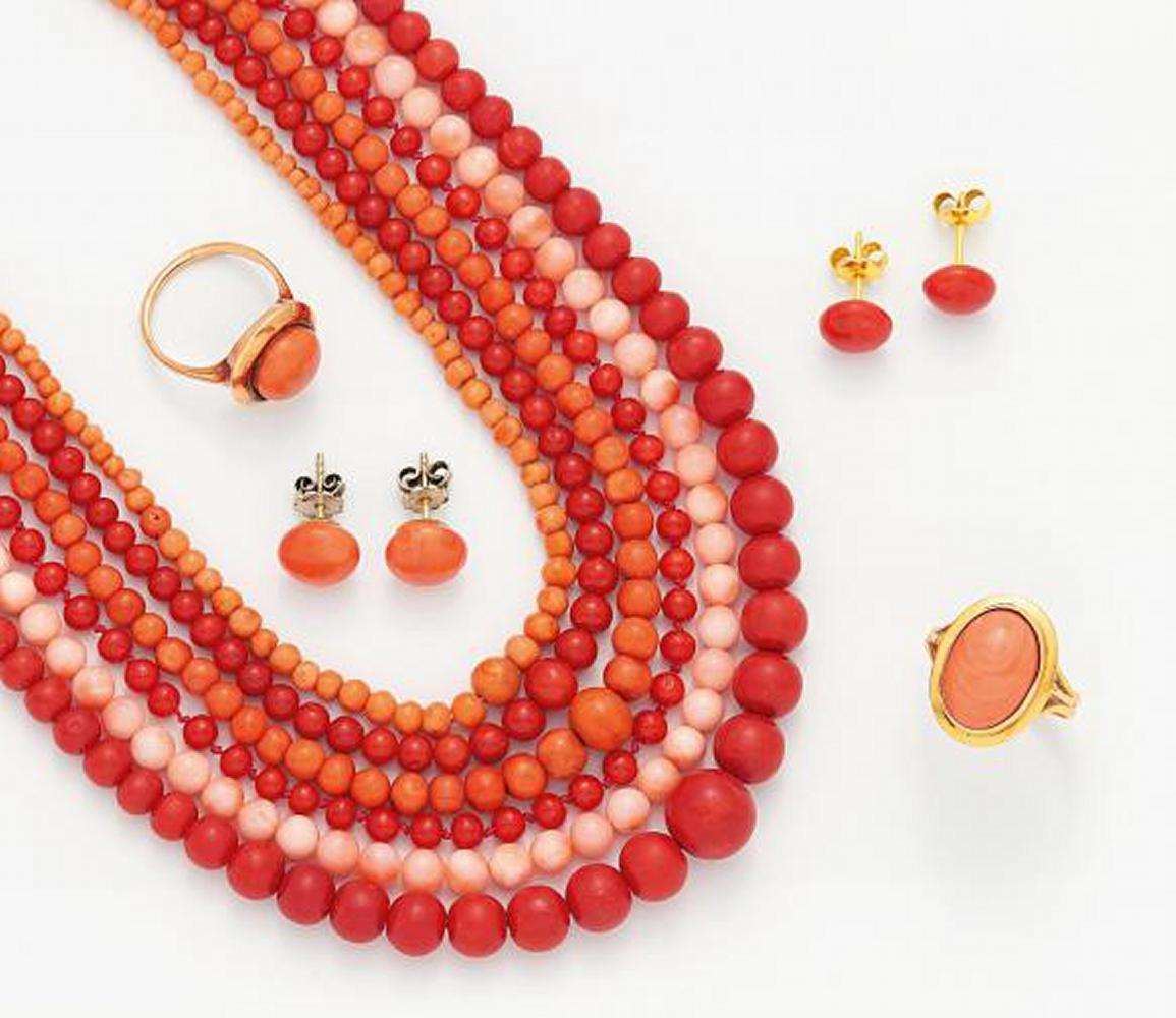 Goldfarben, silbern, Gewicht: Total: 90,5g. EU-RM: 1. 57,5; 2. 51. Colliers: L.ca. 53,0, 43,5, 37,0, 62,5, 47,5cm; Ohrstecker: D.ca. 0,8-0,9cm. Vielzählige Korall-Perlen, teils geknotet, 5 Korallperl-Buttons, 1 ovaler Korallperl-Cabochon.