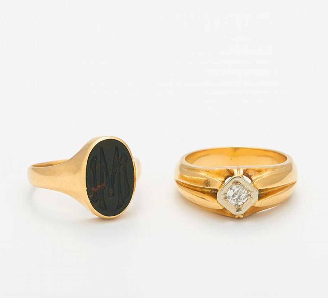585/- Gelbgold, gestempelt, Gewicht: 14,7g. EU-RM: 57,5, 58. 1 Altschliff-Diamant,1 ovale Jaspis-Platte mit Monogramm.