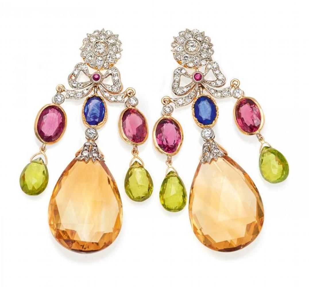 Edelsteine: 2 facettierte Citrine im Briolettschliff D.ca. 21,65 x 16,40mm, 2 oval fac. Saphire zus.ca. 1,80ct, 4 oval fac. Rhodolithe zus.ca. 6,08ct, 4 fac. Peridot-Pampeln D.ca. 8,45 x 6,53mm.