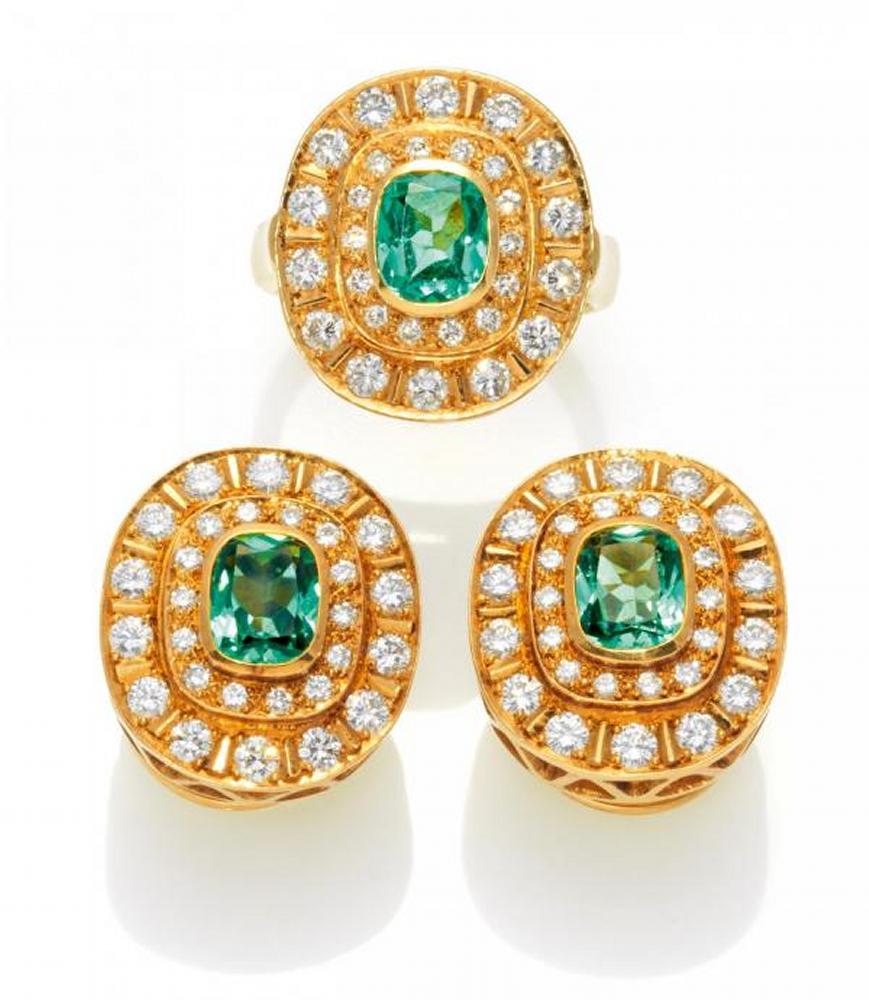 SET: TURMALIN-DIAMANT-RING UND OHRSTECKCLIPS.
