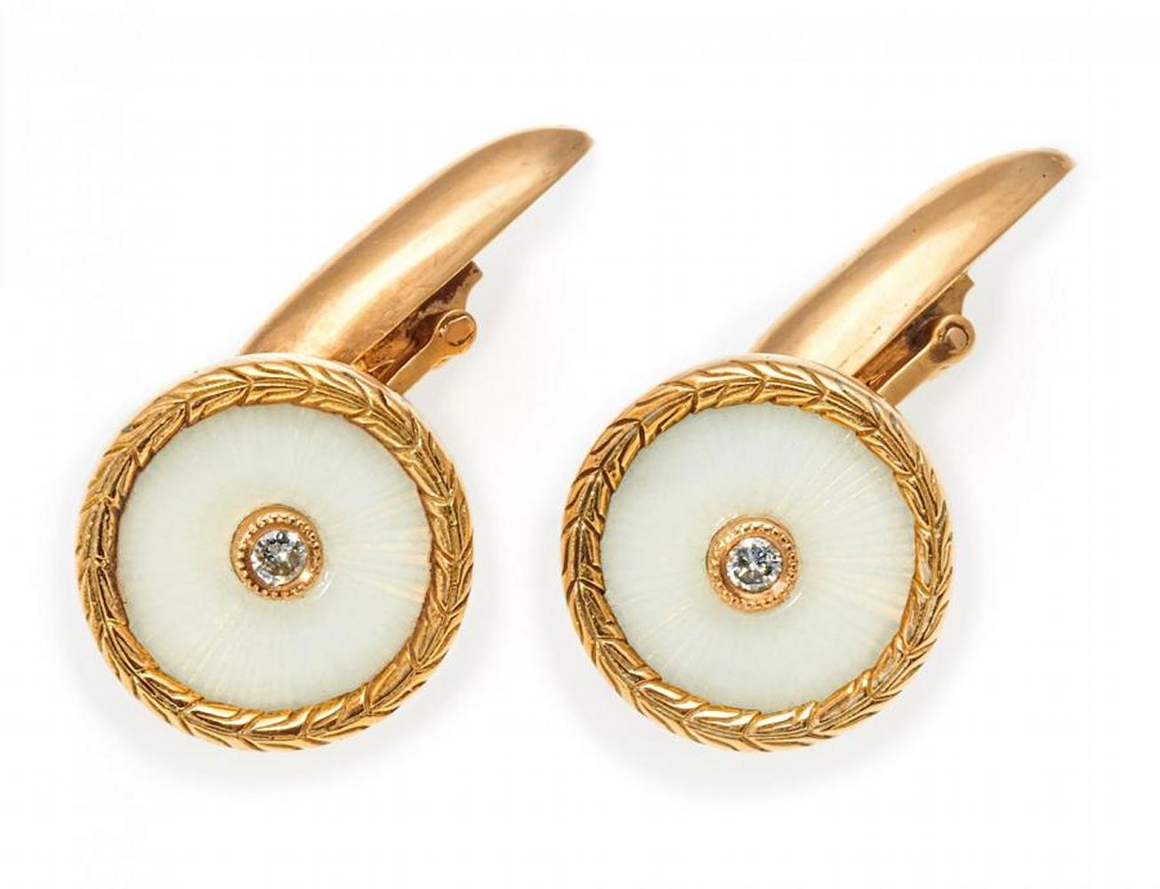 Material: 56/- Zolotnik=ca. 585/- Roségold, weißer Emaillack.