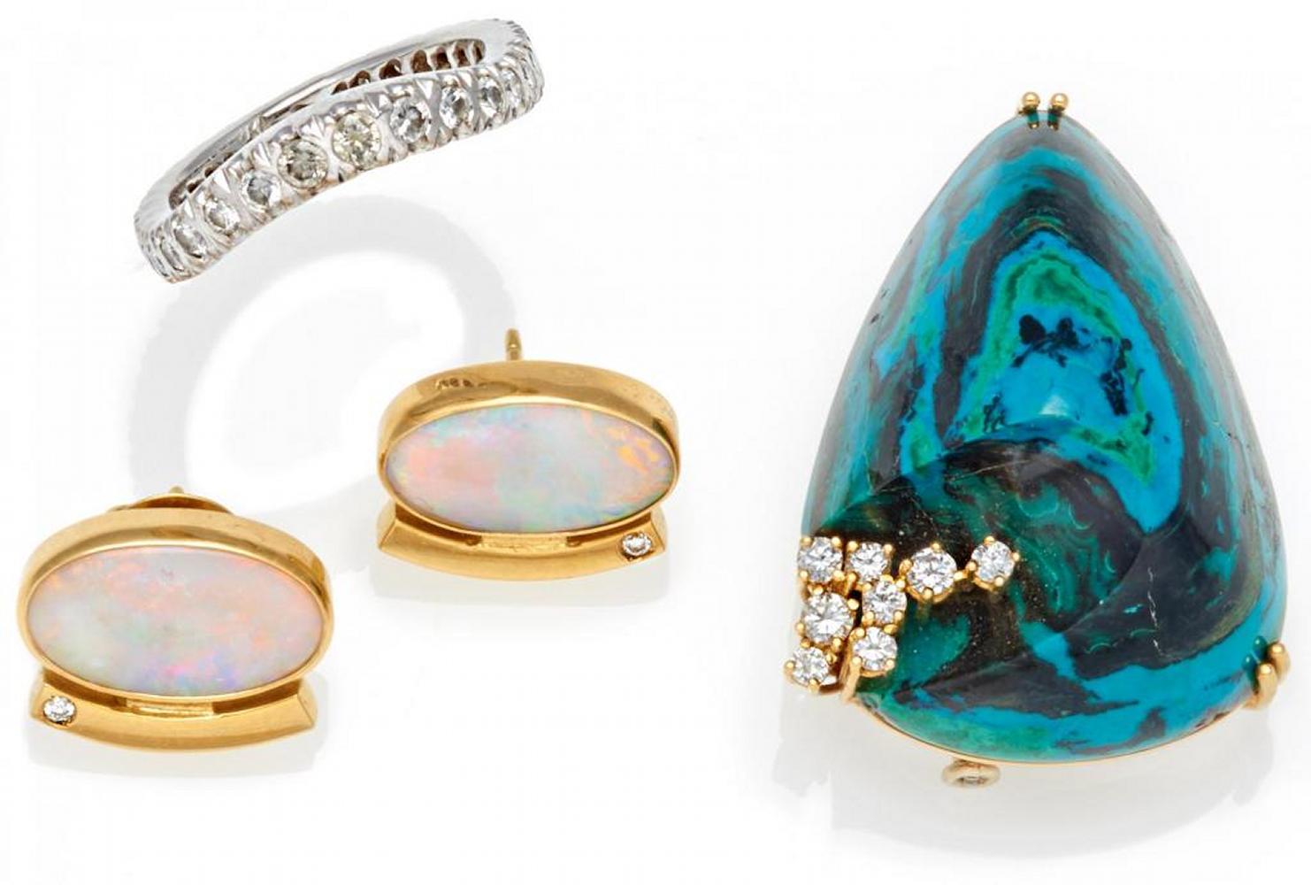 KONVOLUT: DIAMANT-RING, OPAL-DIAMANT-OHRSTECKER, CHRYSOKOLL-BROSCHE.