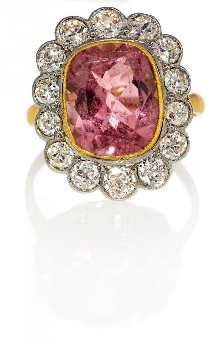 750/- Gelbgold, Platin, Gesamtgewicht: 4,7g. EU-RM: 54. 14 Altschliff-Diamanten zus.ca. 1,7ct Cr(J) VS-P1, 1 rosafarbener, facettierter Turmalin im Scherenschliff ca. 5,0ct.