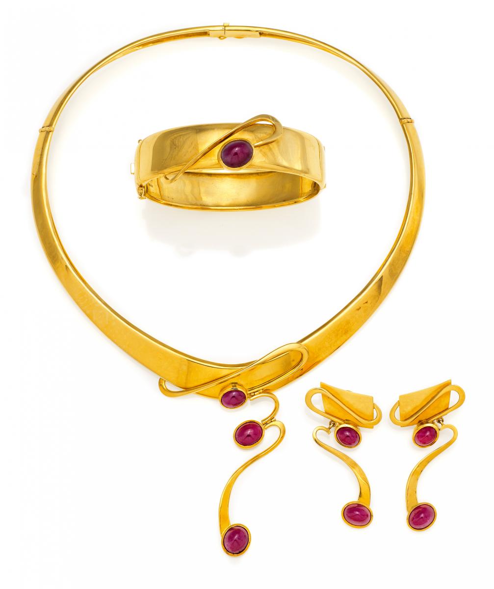 585/- Gelbgold, Gesamtgewicht: 126,5g. Collier Innendurchmesser ca. 13,0cm, Armspange Innendurchmesser ca. 6,0cm, Ohrclips H.ca. 5,2cm. 8 ovale Rubin-Cabochons D.ca. 9,4 x 7,2 - 7,8 x 6,1mm.