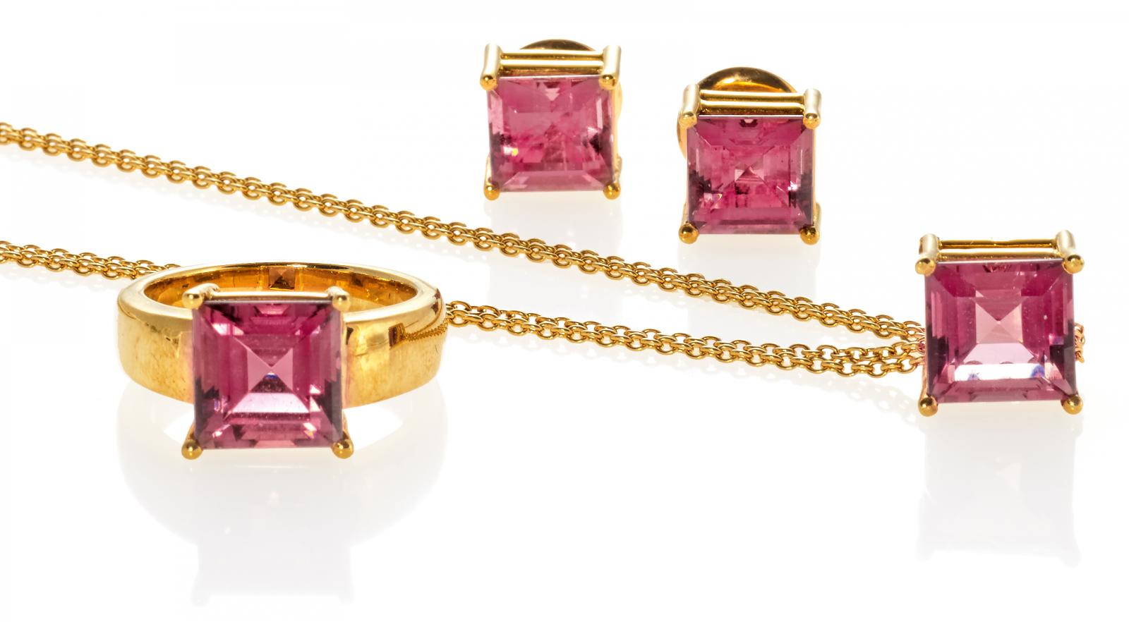 750/- Gelbgold, Gesamtgewicht: 30,5g. EU-RM: 57. Collier L.ca. 45,0cm. 4 facettierte, pinkfarbene Turmaline im Treppenschliff zus.ca. 19,1ct.
