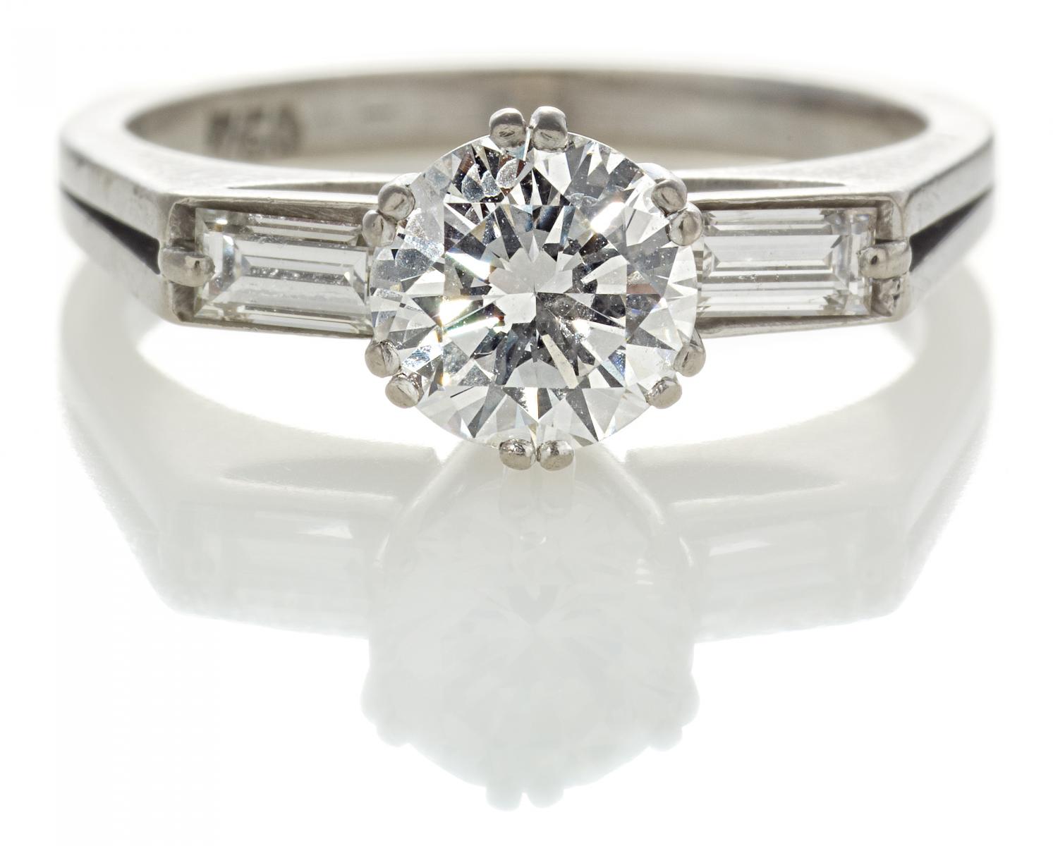 750/- Weißgold, Gesamtgewicht: 4,7g. EU-RM: 53,5. Brillant ca. 1,0ct (W)H VVS2, 2 Diamant-Baguettes zus.ca. 0,2ct.
