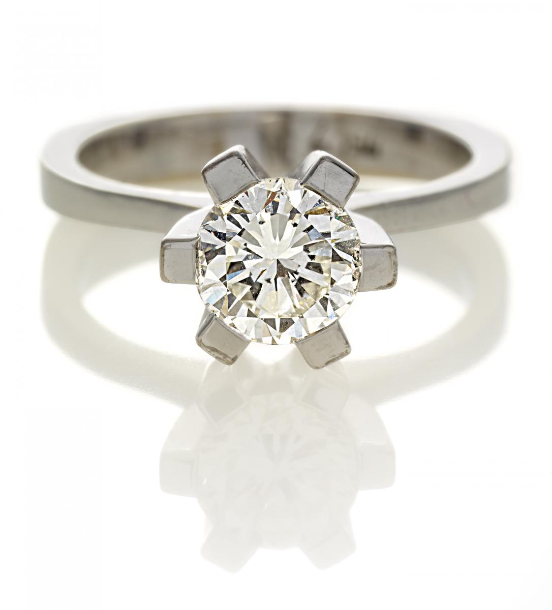 750/- Weißgold, Gesamtgewicht: 6,4g. EU-RM: 53,5. 1 Brillant ca. 1,1ct TCr(J) VVS2.