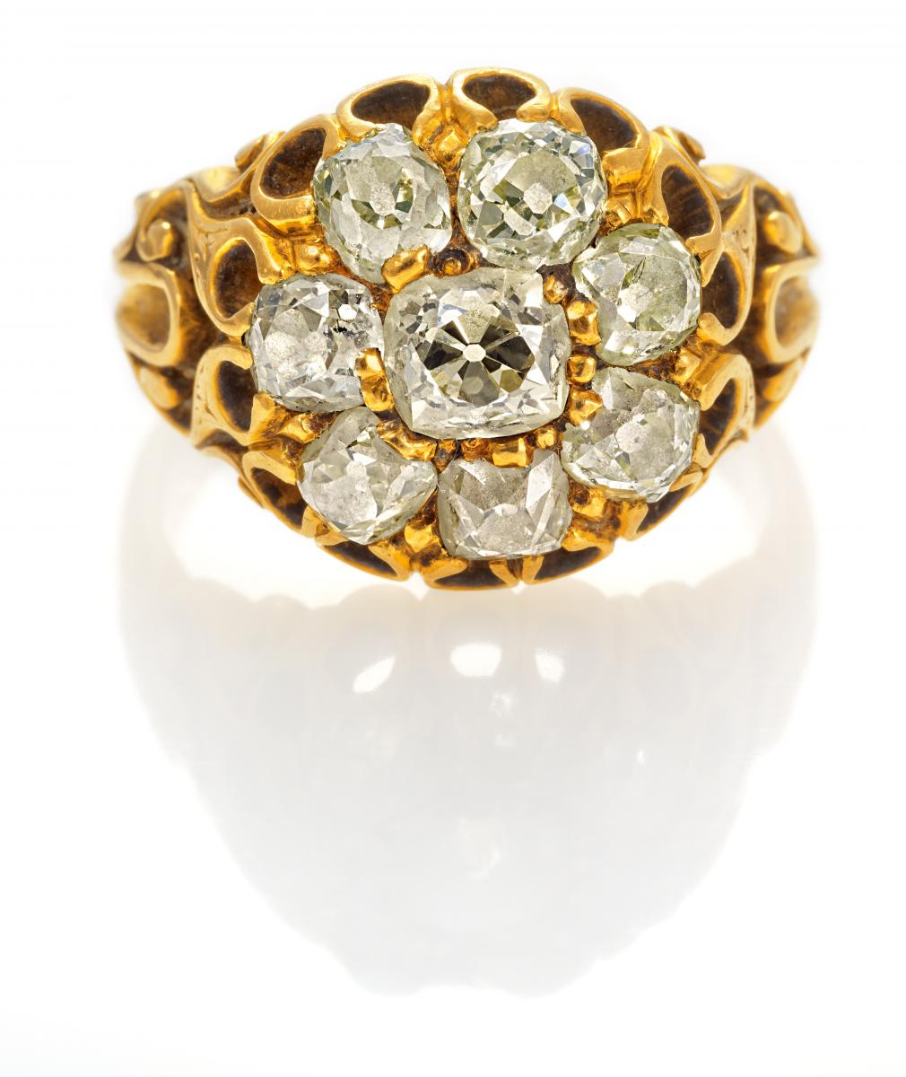 750/- Gelbgold, Gesamtgewicht: 14,1g. EU-RM: 61,5. 8 Altschliff-Diamanten zus.ca. 2,5ct TCr-Cr(I-J) VS-SI.