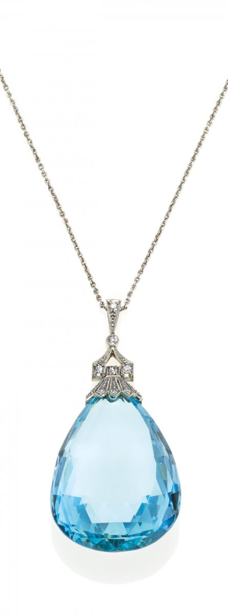 750/- Weißgold, Gesamtgewicht: 16,6g. L.ca. 60,0cm, leicht verknotet. 10 8/8-Diamanten zus.ca. 0,2ct, 1 facettierter Aquamarin-Tropfen D.ca. 35,2x22,8x12,0mm.