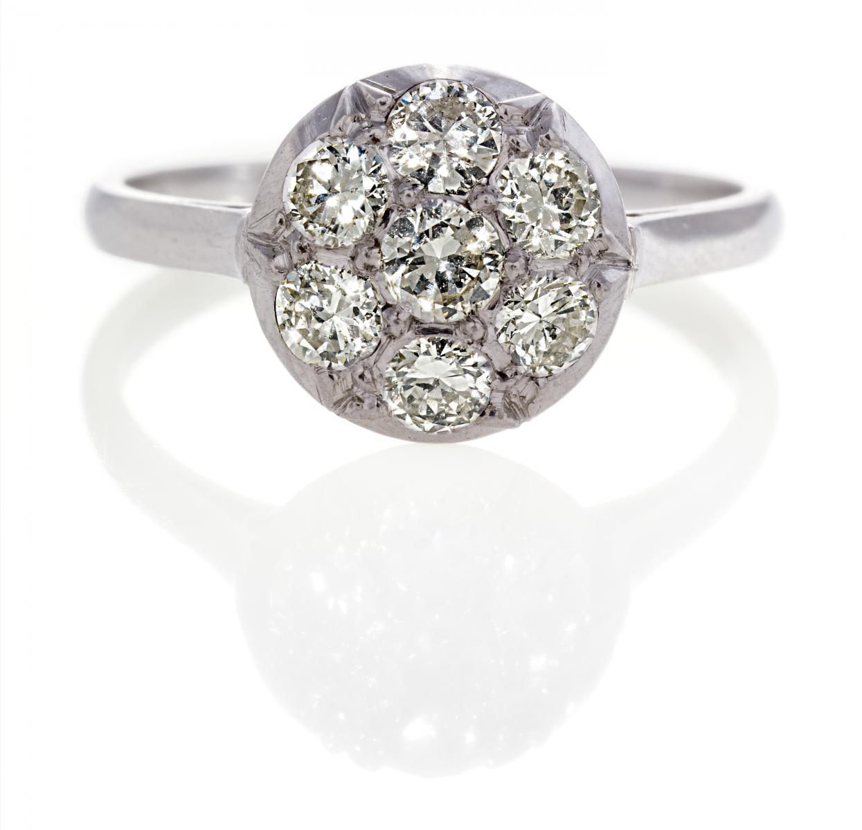 900/- Platin, Punzen, Gesamtgewicht: 2,9g. EU-RM: 52,5. 7 Diamanten im Übergangsschliff zus.ca. 0,8ct W-Cr(H-J) VS-P1.