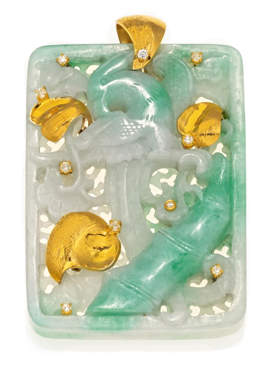 750/- Gelbgold, Gesamtgewicht: 90,5g. H x B=ca. 8,1 x 5,2cm (inkl. Öse). 10 Diamanten im Alt- und Brillantschliff zus.ca. 0,5ct, 1 handgravierte Jadeit-Platte mit Vogeldarstellung und floralen Elementen.