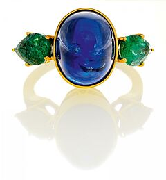 585/- Gelbgold, Gesamtgewicht: 7,1g. EU-RM: 54. 1 ovaler Saphir-Cabochon ca. 11,4ct, 2 facettierte Smaragd-Tropfen zus.ca. 1,5ct.
