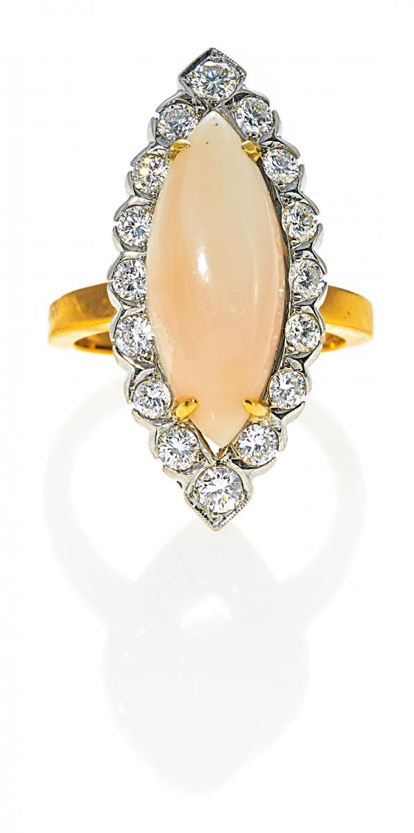 585/- Gelbgold, rhodiniert, Gesamtgewicht: 8,0g. EU-RM: 52,5. 16 Brillanten zus.ca. 0,8ct, 1 Engelshautkorall-Navette D.ca. 20,2 x 8,3mm.
