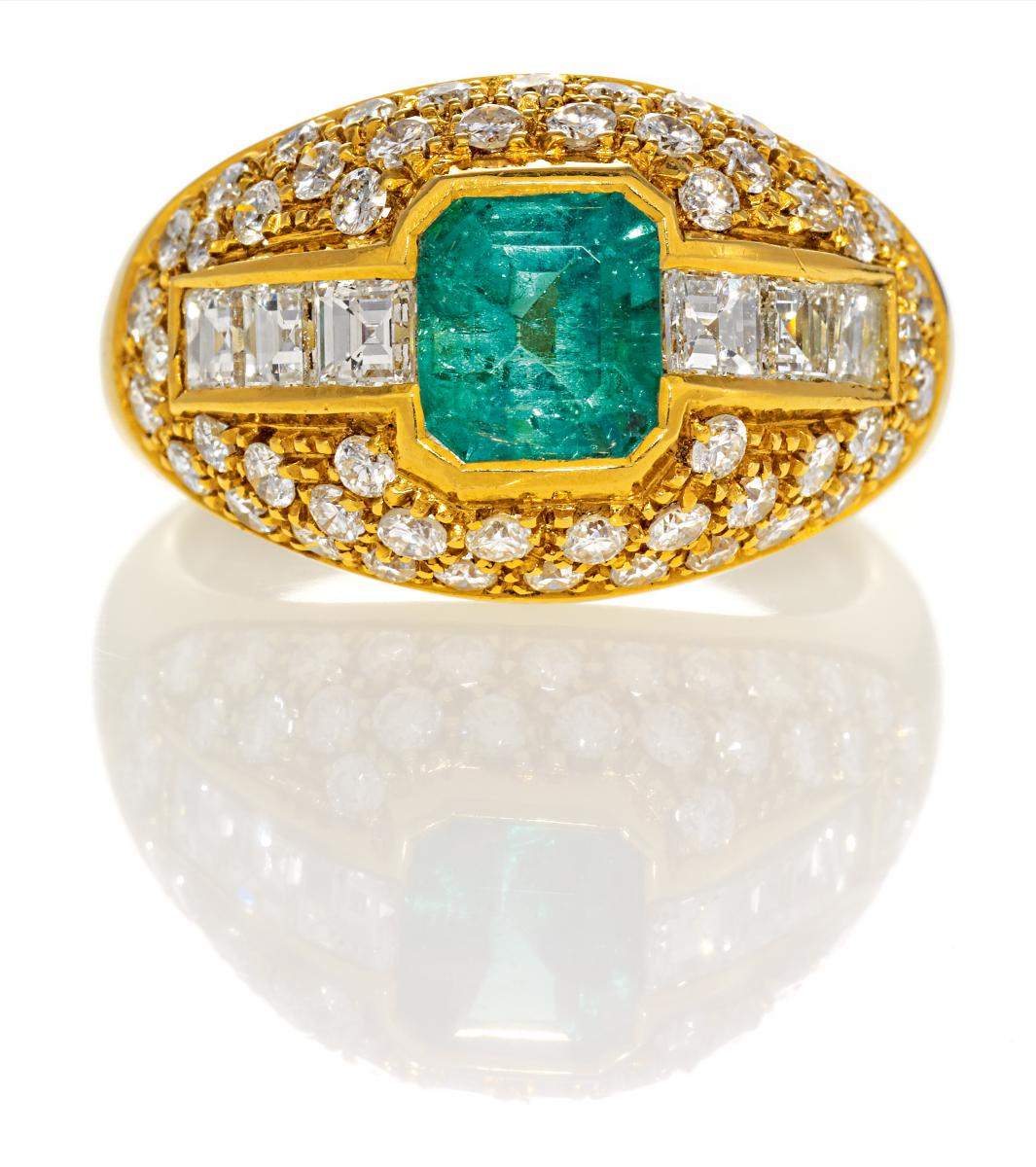 750/- Gelbgold, Gesamtgewicht: 8,7g. EU-RM: 50. 6 Diamant-Karrees und 48 Brillanten zus.ca. 0,8ct, 1 facettierter Smaragd im Emerald Cut ca. 1,0ct.