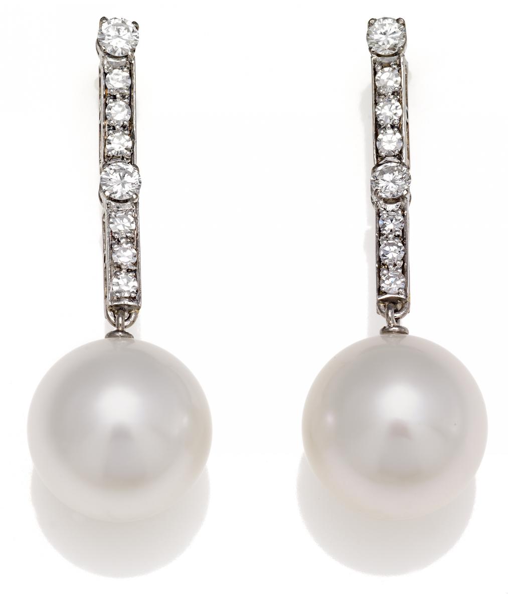 750/- Weißgold, Gesamtgewicht: 11,8g. H.ca. 4,2cm. 16 Diamanten im 8/8- und Brillantschliff zus.ca. 0,7ct, 2 Südsee-Zuchtperlen, rund, D.ca. 14,3mm, weiß-irisierendes rosé.