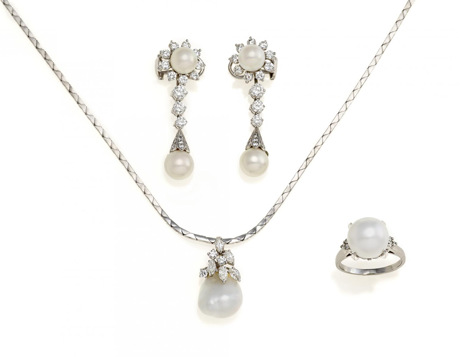 Ring: 900/- Platin, Ohrsteckclips und Collier: 585/- Weißgold, Gesamtgewicht: 37,0g. EU-RM: 56. Collier L.ca. 44,0cm, Ohrgehänge H.ca. 4,2cm. Ca. 50 Diamanten im Navette- und Brillantschliff zus.ca. 2,5ct TW-W(G-H) VVS-VS, 1 barocke Zuchtperle, grau, D.ca. 12,8 x 14,1mm, 1 Südsee-Zuchtperle, grau, rund, D.ca. 11,8mm, 4 Akoya-Zuchtperlen, creme-rosé, rund, D.ca. 8,9mm.