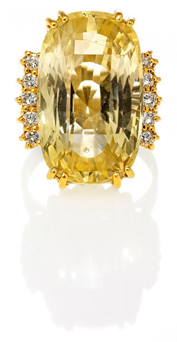 750/- Gelbgold, Gesamtgewicht: 16,4g. EU-RM: 55. 10 Brillanten zus.ca. 0,3ct, 1 facettierter, gelber Saphir im Cushion Cut ca. 30,66ct, Sri Lanka, unbehandelt.