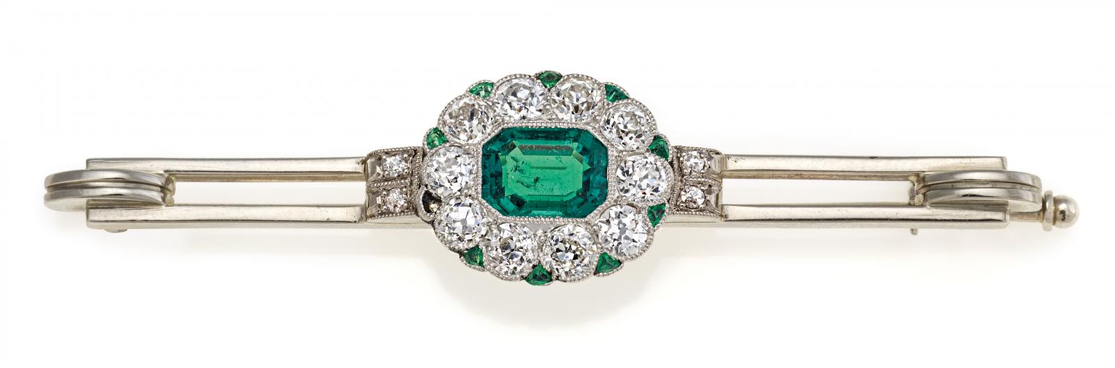 750/- Gelbgold, Platinverbödung, Gesamtgewicht: 7,5g. L.ca. 6,0cm. 4 8/8-Diamanten, 10 Altschliff-Diamanten zus.ca. 1,1ct, 1 facettierter Smaragd im Emerald Cut ca. 1,1ct, 9 fancy cut Smaragde (1 fehlend).