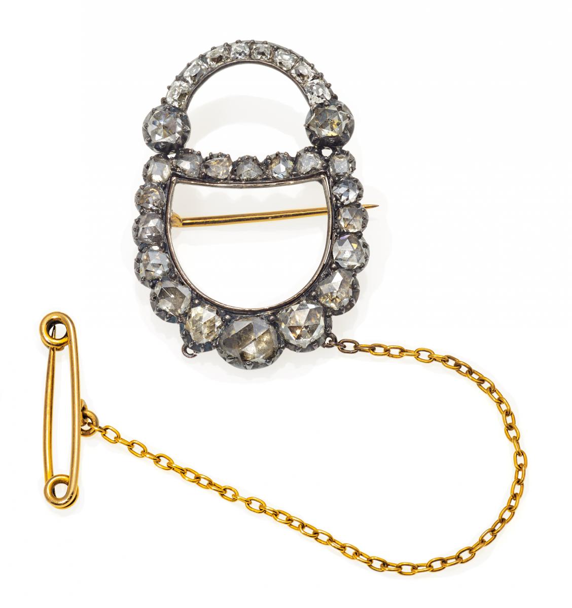 Silber/geschwärzt, 585/- Roségold, Gesamtgewicht: 6,0g. 27 folierte Diamanten im Karree- und Rosenschliff, rückseitig geschlossen gearbeitet, zus.ca. 1,2ct. Teils beschädigt.