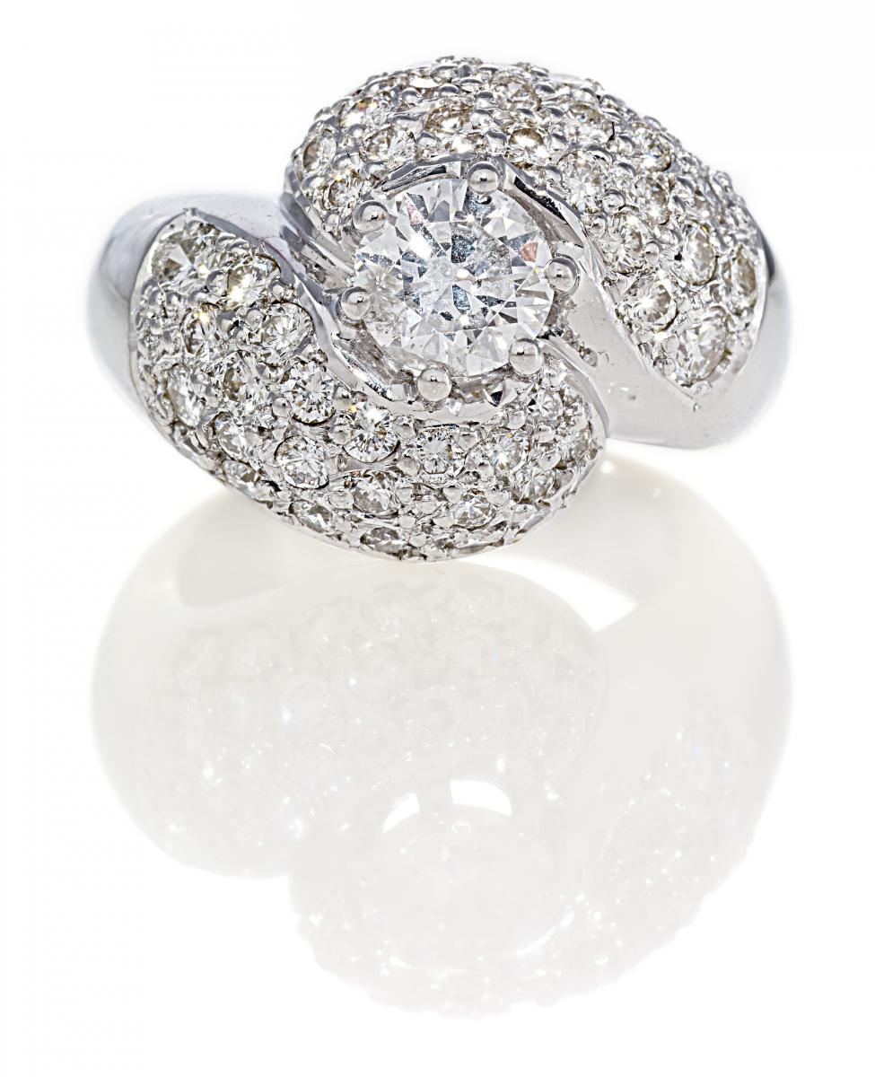 750/- Weißgold, Gesamtgewicht: 17,4g. EU-RM: 53. 1 Diamant im Übergangsschliff ca. 0,9ct W(H) SI2, ca. 46 Brillanten zus.ca. 0,7ct.