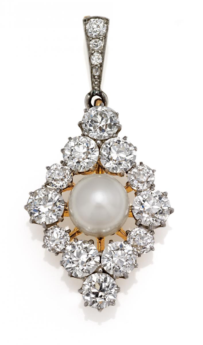 585/- Roségold, Platinverbödung, Gesamtgewicht: 5,7g. L.ca. 3,5cm. 15 Diamanten im Alt- und Rosenschliff zus.ca. 2,6ct TCr-Cr(I-J) VS-SI2, 1 Zuchtperl-Button, weiß, D.ca. 7,1mm.