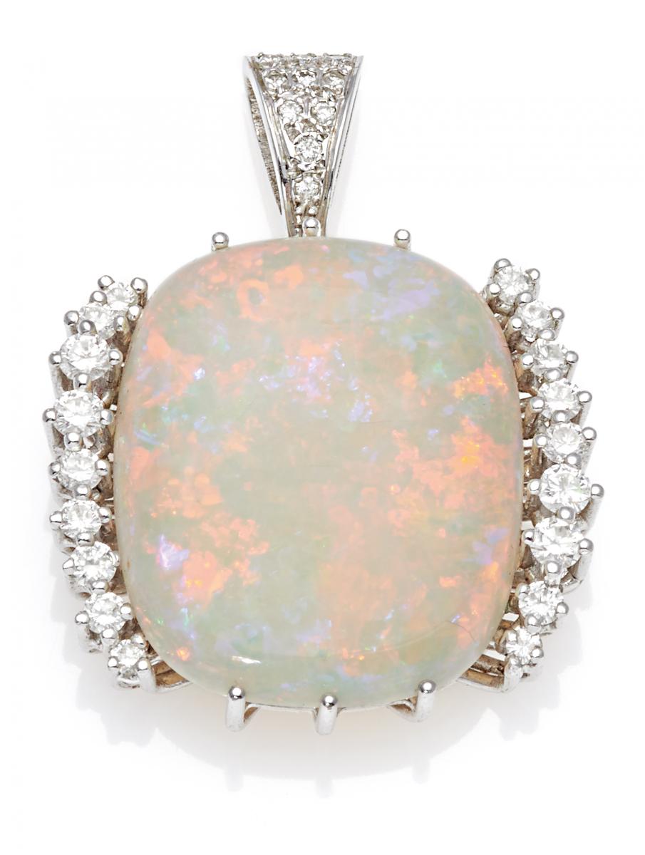 750/- Weißgold, Gesamtgewicht: 10,5g. L.ca. 3,5cm. 29 Brillanten zus.ca. 0,7ct, 1 weißer Opal, viermal mugelig, ca. 9,2ct.