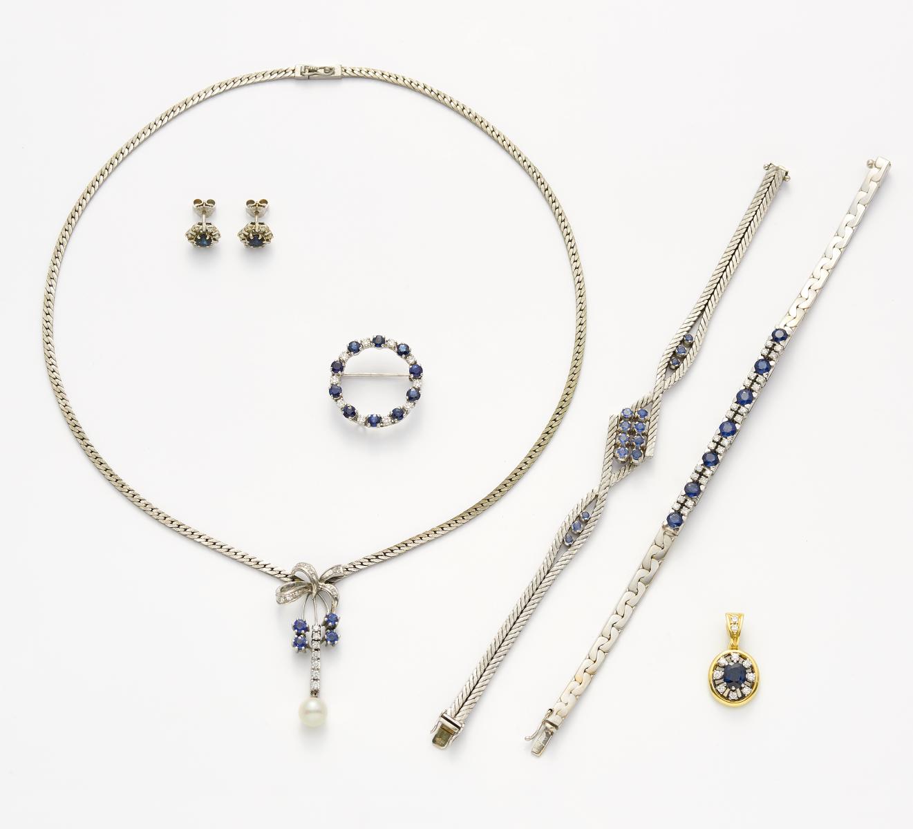 Maße: Collier L.ca. 44,5cm, A.band 18,5cm, Brosche D.ca. 2,4cm, Anhänger L.ca. 2,4cm, Ohrstecker D.ca. 0,8cm.