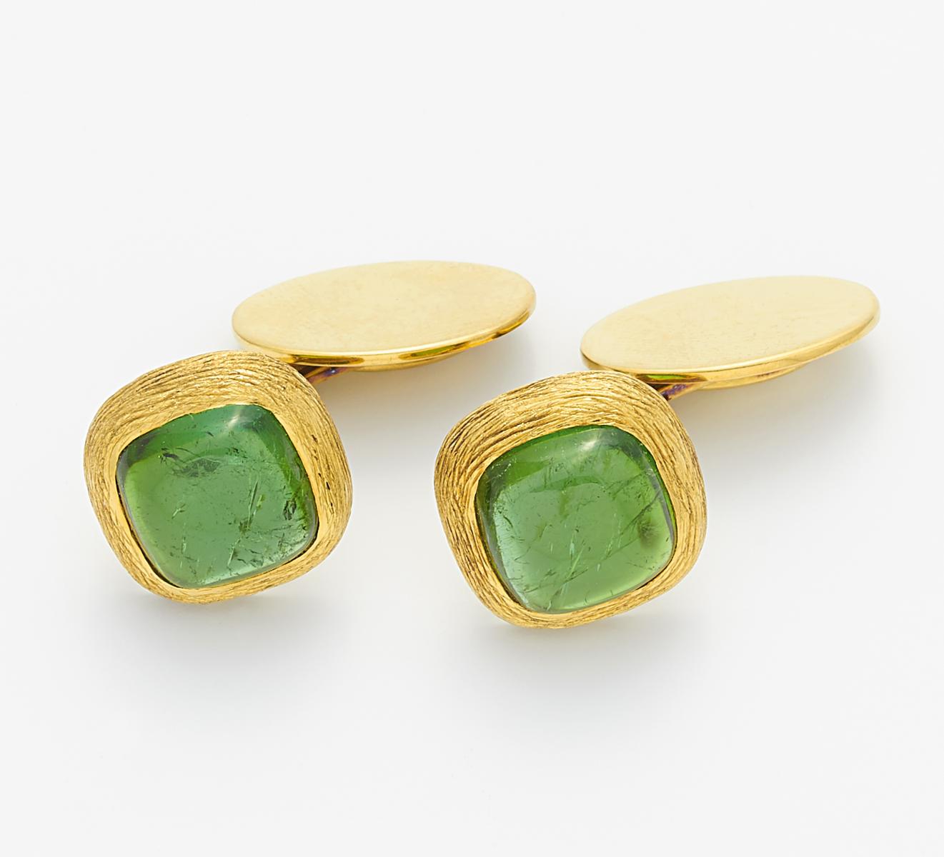 Edelsteine: 2 leicht viereckige Turmalin-Cabochons..