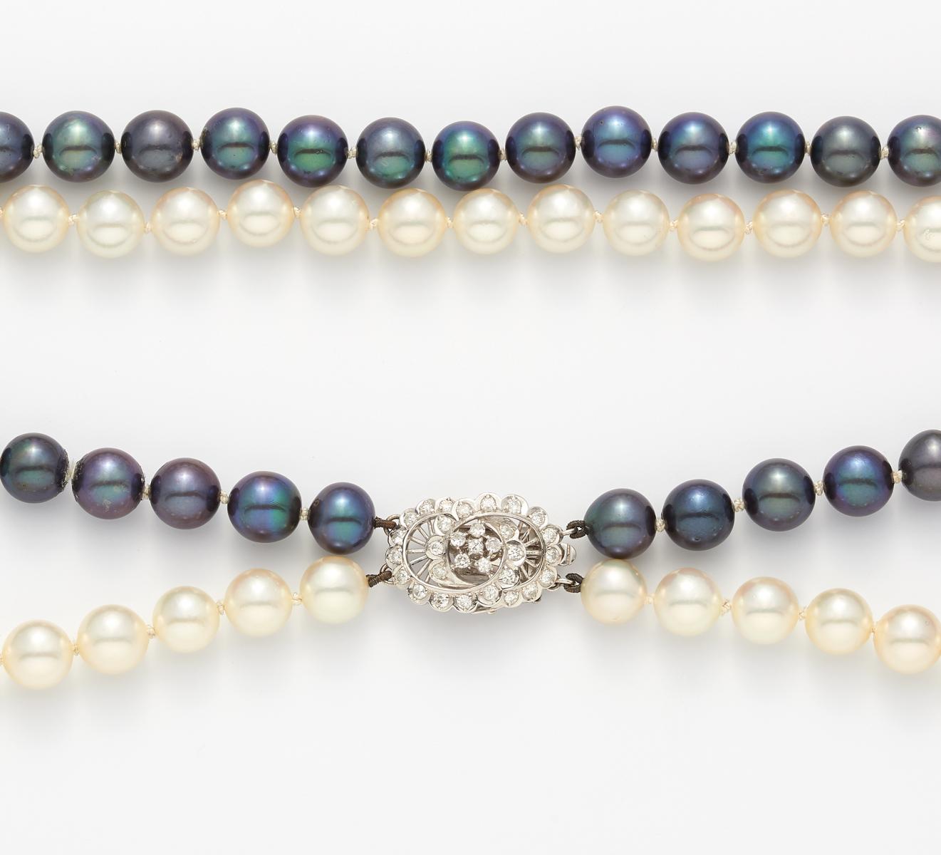 Org. Substanzen: 96 Akoya-Zuchtperlen, D.ca. 7,8-8,4mm, weiß-creme, 93 Tahiti-Zuchtperlen, D.ca. 8,5-9,0mm, grau-anthrazit.