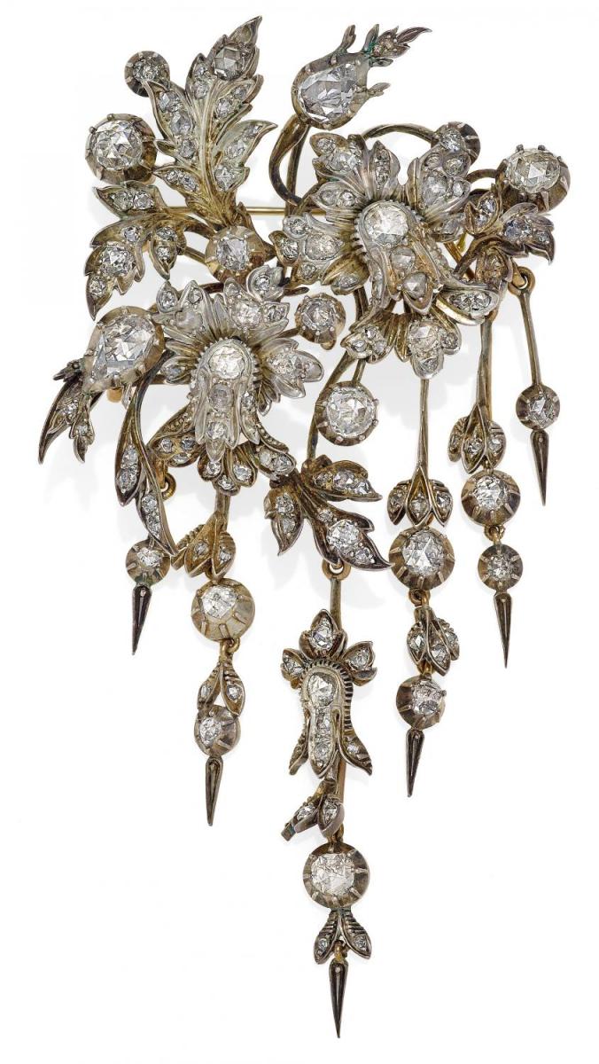 585/- Gelbgold, Silberverbödung, Gesamtgewicht: 45,5g. H.ca. 11,0cm. Ca. 65 teils folierte Diamanten im Alt- und Rosenschliff zus.ca. 5,8ct TCr-Cape(I-N) VS-P1.