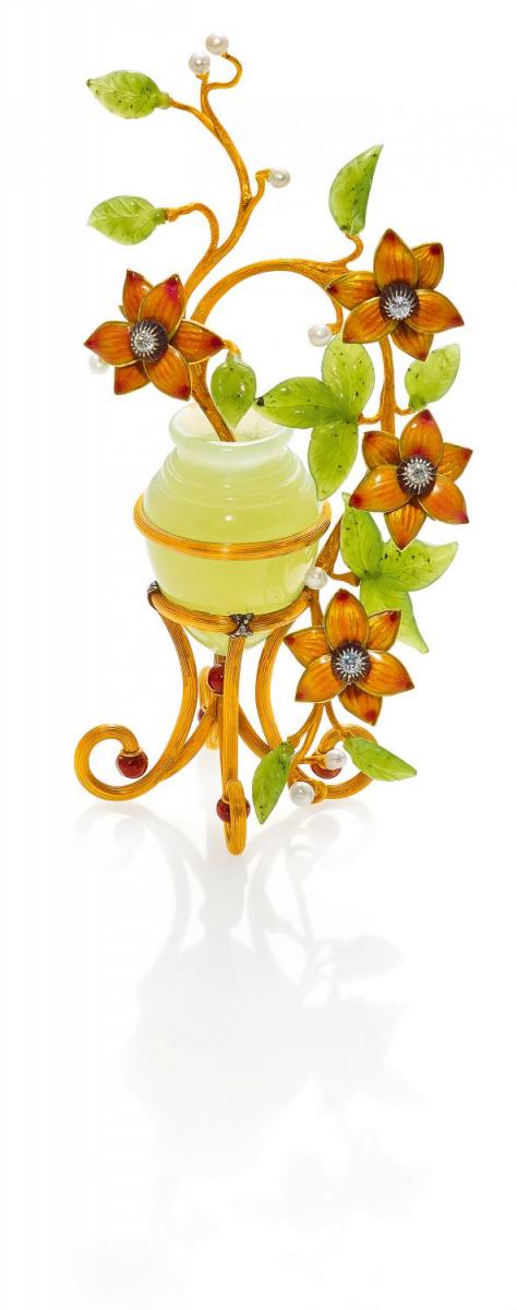 56 Zolotnik=ca. 585/- Gelbgold, Silberverbödung, Meisterpunze MP, farbiges Email, Gesamtgewicht: 122,4g. H.ca. 13,5cm. 4 Altschliff-Diamanten zus.ca. 0,5ct, 48 Diamantrosen, handgravierte Nephrit-Blätter, Vase aus Nephrit, 9 rund-leicht barocke Naturperlen, D.ca. 3,5mm, creme-apricot.