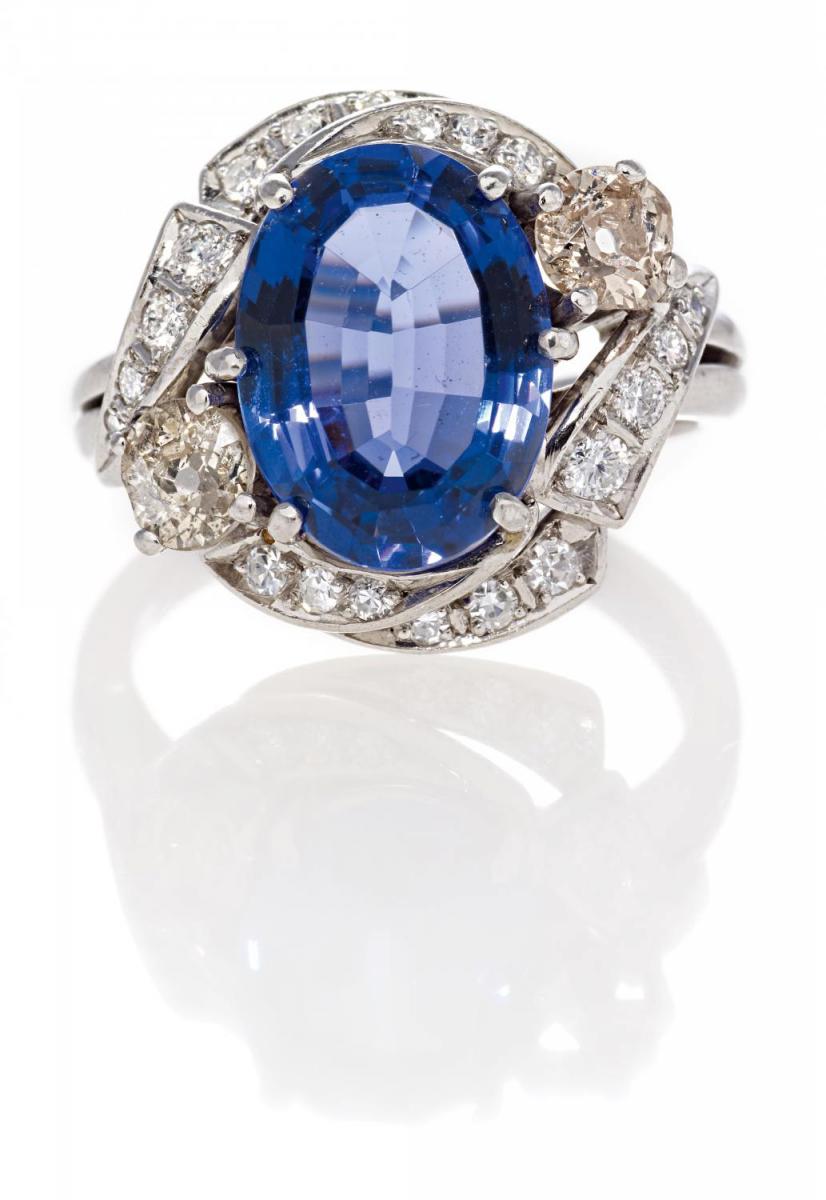 750/- Weißgold, Gesamtgewicht: 9,2g. EU-RM: 57. 22 Diamanten im Alt-/Brillant- und 8/8-Schliff zus.ca. 0,9ct TCr-Cape(I-O)-cognacfarben VS-P2 (Altschliffe teils mit Kerben), 1 oval facettierter Tansanit ca. 5,2ct.