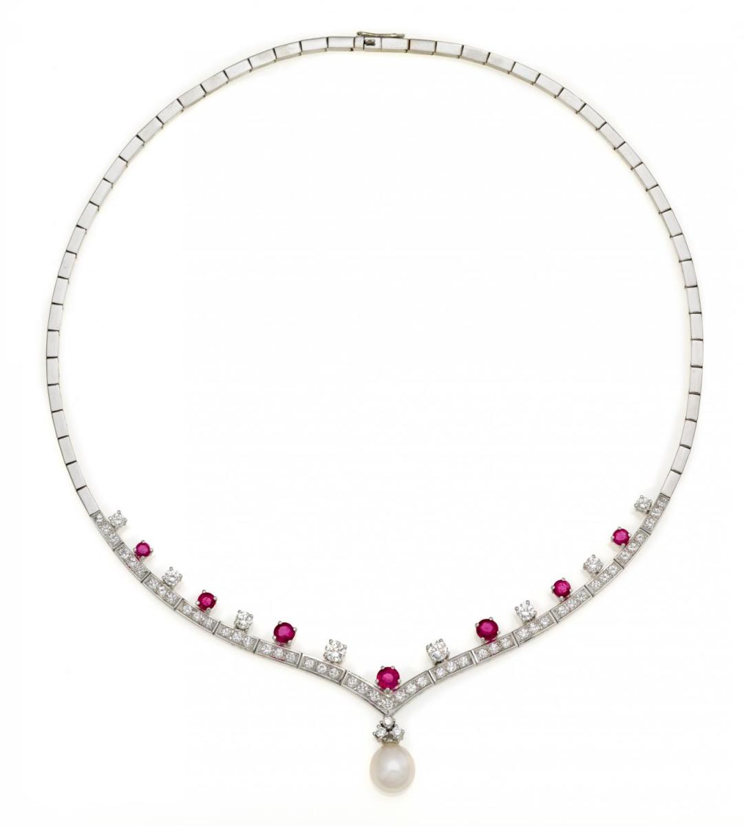 750/- Weißgold, Gesamtgewicht: 30,0g. L.ca. 40,8cm. 2 Brillanten zus.ca. 0,4ct TW(G) IF-VVS1, 58 Brillanten zus.ca. 2,9ct, 7 rund facettierte Rubine zus.ca. 2,1ct, 1 Akoya-Zuchtperle, tropfenförmig-oval, D.ca. 9,5-9,6 x 9,0-9,1mm, leicht creme-rosé.