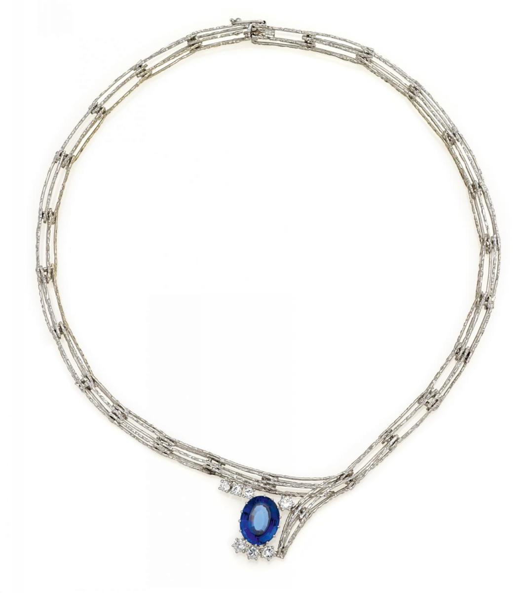 750/- Weißgold, Gesamtgewicht: 34,0g. L.ca. 42,5cm. 7 Brillanten zus.ca. 0,8ct, 1 oval facettierter Tansanit ca. 6,9ct.